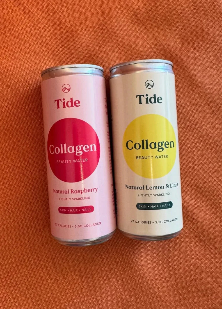 Tide Collagen are sparkling, raspberry or lemon flavoured collagen water beverages marketed for beauty benefits like improved skin, hair, and nail health.