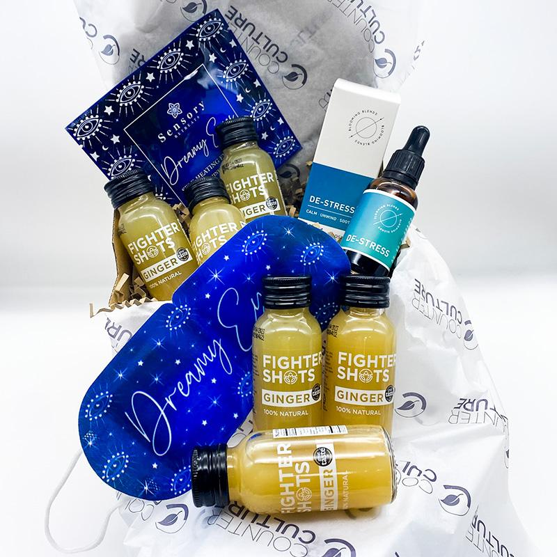 De-Sress & Detox Wellness Box combines a Blooming Blends "DeStress" Botanical Tincture to help soothe the symptoms of anxiety, Dreamy Eyes Self-Heating Eye Masks (2 masks) to help you switch off for a great night's sleep