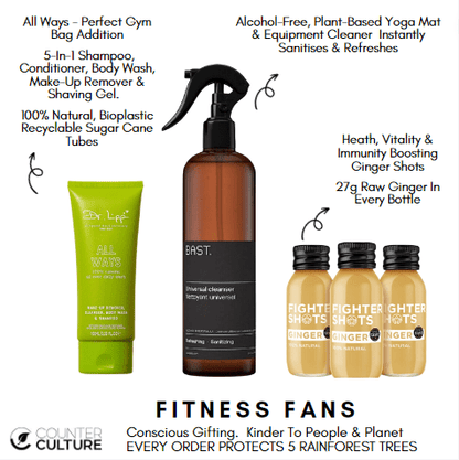 Perfect for fitness fans & gym lovers. Dr Lipps Allways, the ultimate 5 in 1 product is the ideal product for every gym bag. A make-up remover, face cleanser, body wash, shampoo and shaving gel all in one tube. 100% natural with only 9 ingredients. We've paired it with the award-winning BAST Paris Universal Cleanser (best yoga mat & gym equipment cleaner) and 3 Ginger Fighter Shots, for a post workout pick-me-up!