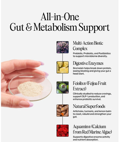 Flaxseed Powder, Multi-Action Biotic (Baobab Powder, Artichoke Powder, Lactobacillus acidophilus LA1 Postbiotic, Bacillus clausii BCL19), Calcium from Red Marine Algae (Aquamin TG), Ginger Root Powder, Lemon Balm Extract, Feiolix® (Feijoa Fruit Extract), Pineapple Fruit Powder, Bromelain, Turmeric Powder
