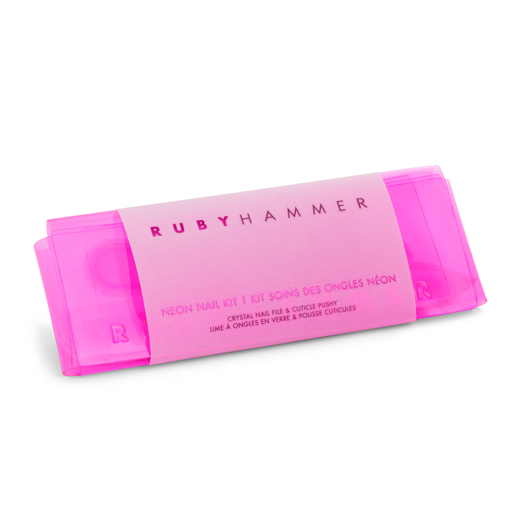 Expertly crafted and thoughtfully combined, the Ruby Hammer Nail Kit comprises a luxe glass nail file and dual ended glass cuticle pusher in a neon-pink pouch, offering all the components necessary for maintaining nails wherever you may find yourself. The gentle yet effective file promotes strong healthy nails by sealing the nail edge as you file.
